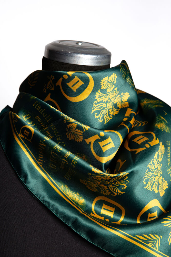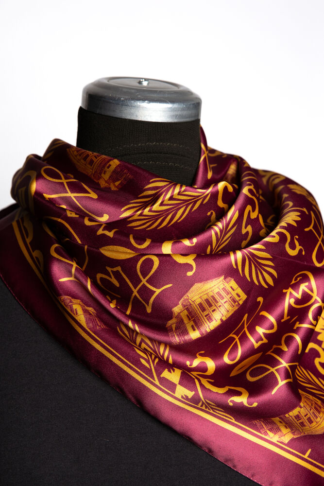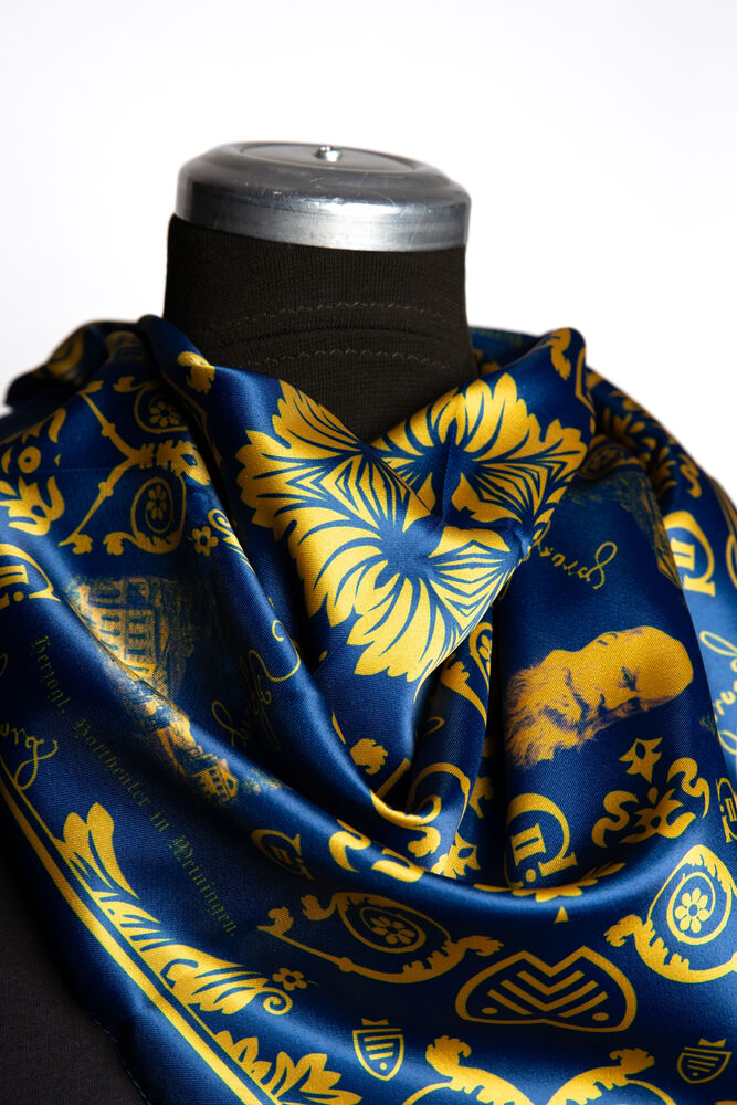 Zur Jubiläums-Saison „200 Jahre Herzog Georg II. von Sachsen-Meiningen“ sind die Satintücher in drei Farben erhältlich: Die bordeauxrote Variante zieren u.a. ein Stich des Herzoglichen Hoftheaters, die Insignien von Georg II. und Ornamente, die Sie noch heute in den Stuck-Verzierungen des Staatstheaters entdecken können. Das tiefblaue Tuch kombiniert bauliche Ornamente mit der herzoglichen Unterschrift, seinem Konterfei, einer historischen Theater-Ansicht sowie kaleidoskopartigen Anordnungen des aktuellen Logos. Das petrolgrüne Satintuch schließlich zeigt die Profilansicht des Theaterzerzogs als Skulptur, Ornamente, den Schriftzug „Seiner Hoheit dem Herzog Georg“, Initialen und Ornamente.